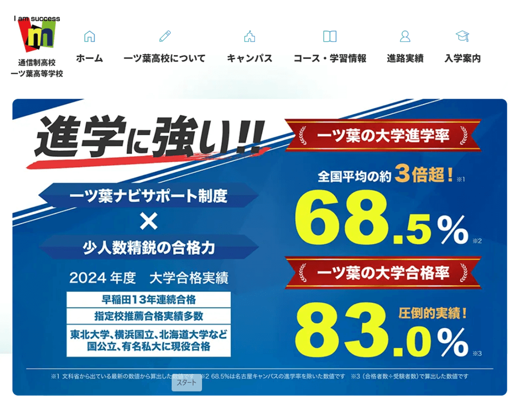一ツ葉高等学校は、国公立大学や難関私立大学への合格実績を多数持ち、通信制では珍しく進学コースが充実しています。